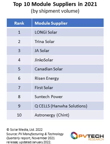 據(jù)PV-Tech介紹,2021年全球光伏行業(yè)實現(xiàn)跨越式發(fā)展,光伏行業(yè)整體產(chǎn)能和出貨量均超過 190GW,與PV-Tech2020 年底對 2021 年預測高度一致。出貨量排名預測結(jié)果主要基于持續(xù)跟蹤各家組件企業(yè)全年的產(chǎn)能和出貨量而得出。2021年全球前 10 名組件供應商出貨量具體排名如下: