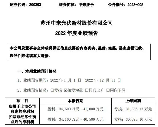 中來股份(300393)近日發布2022年年度業績預告,報告期內歸屬于上市公司股東的凈利潤34,600萬元–41,000萬元,較上年同期扭虧為盈。