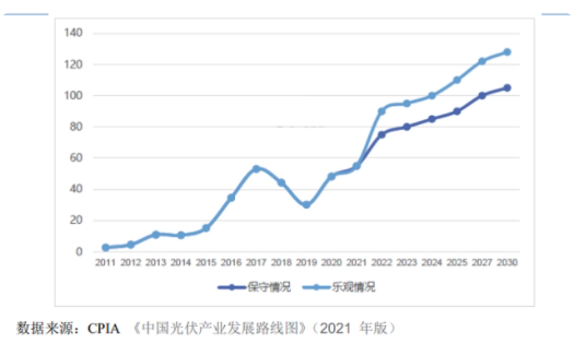 根據光伏產業協會數據顯示和預計,過去十年(2011-2021年)的新增裝機規模呈現爆炸式增長,未來8年(2022-2030年)年新增規模仍將保持高速增長。光伏行業未來很長一段時間都將是一個“風口”行業。