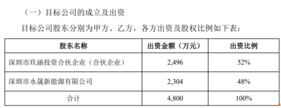 聯合出資競拍,加速布局新能源領域本次公告顯示,深圳永晟與玖涵投資共同成立的合資公司注冊資本為4800萬元,其中玖涵投資以人民幣現金出資2496萬元,占注冊資本的52%;深圳永晟以人民幣現金出資2304萬元,占注冊資本的48%。