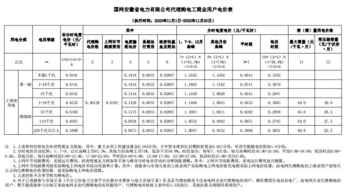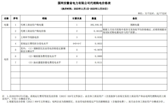 近日,安徽電網有限責任公司公布了安徽省2023年11月電網代理購電價格,為0.46128元/千瓦時,環比上月持平。
