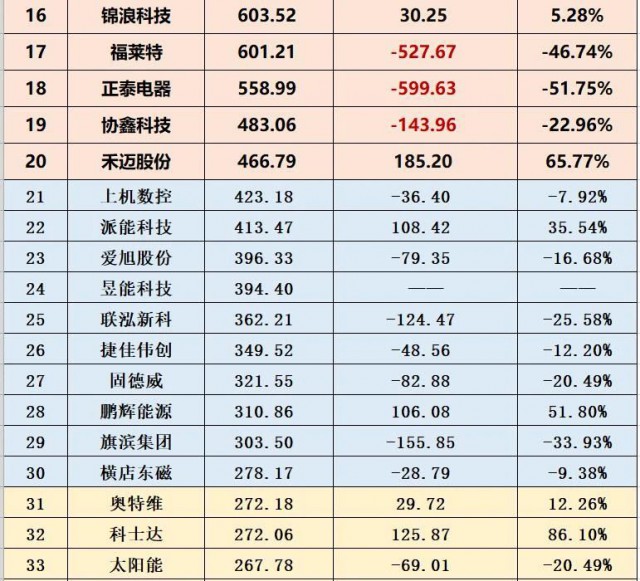 如下表,總市值排在前20的光伏企業,其市值較今年1月1日,其中18家均出現不小幅度下跌。隆基綠能總市值減少1592億,通威股份減少313億,三峽能源跌去577億,陽光電源跌去805億。此外,先導智能、福萊特、正泰電器、晶科科技、海優新材等不少企業,相比年初,總市值幾乎都是“腰斬”。