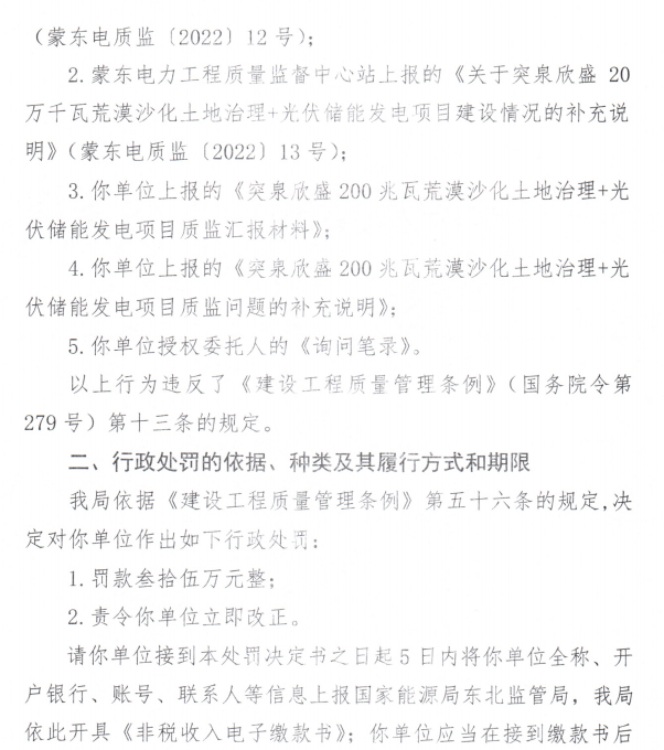 日前,東北能源監管局向突泉欣盛太陽能發電有限公司開出一張罰單,經調查核實,你單位投資建設的突泉欣盛200兆瓦荒漠沙化土地治理+光伏儲能發電項目未按照國家有關規定辦理工程質量監督手續。