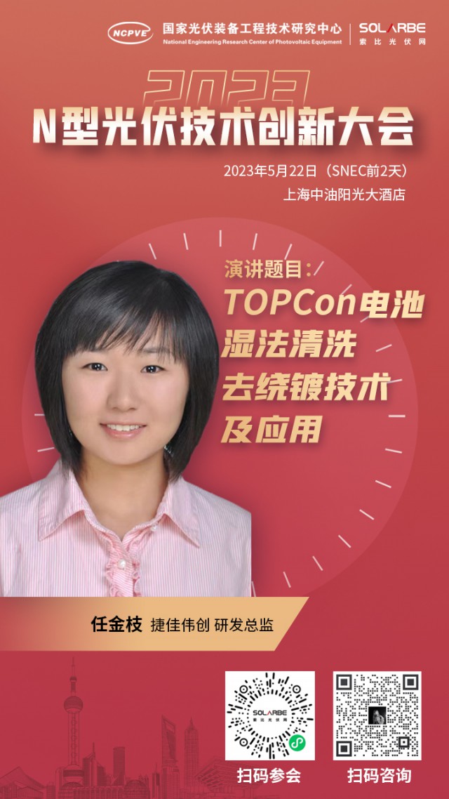5月22日,捷佳偉創受邀參加2023年首屆N型光伏技術創新大會,公司研發總監任金枝將發表題為“TOPCon電池濕法清洗去繞鍍技術及應用”的主題演講,與晶科能源、湖南紅太陽、帝爾激光等多家企業探討TOPCon電池量產降本增效的解決方案。