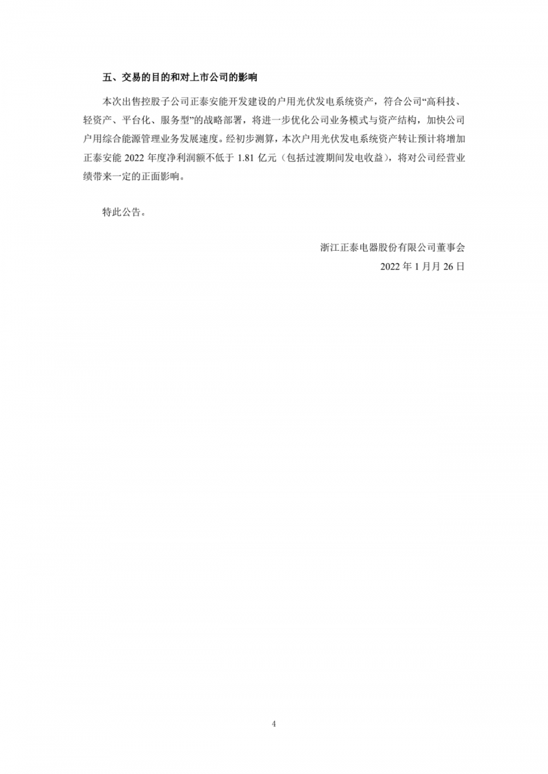 正泰電器認為,本次出售控股子公司正泰安能開發建設的戶用光伏發電系統資產,符合公司“高科技、輕資產、平臺化、服務型”的戰略部署,將進一步優化公司業務模式與資產結構,加快公司戶用綜合能源管理業務發展速度。經初步測算,本次戶用光伏發電系統資產轉讓預計將增加正泰安能2022年度凈利潤額不低于1.81億元(包括過渡期間發電收益),將對公司經營業績帶來一定的正面影響。