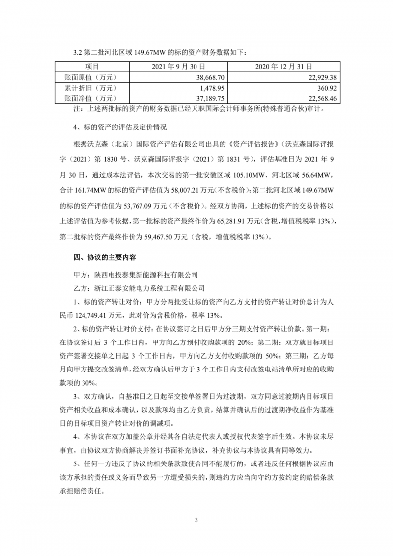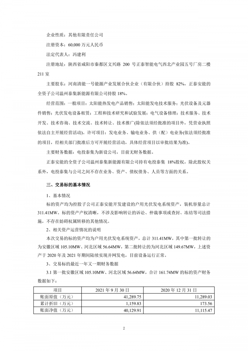 根據交易公告,正泰安能與電投泰集簽訂資產收購協議,將其所持有的河北及安徽區域總計311.41MW戶用光伏發電系統資產分兩批轉讓給電投泰集,交易對價總計為124749.41萬元(均為含稅價,增值稅稅率13%);其中第一批轉讓安徽區域 105.10MW、河北區域56.64MW,合計161.74MW,交易對價為65281.91萬元(含稅價,增值稅稅率13%);第二批轉讓河北區域149.67MW,交易對價為59467.50萬元(含稅價,增值稅稅率13%)。上述資產交割完成后,正泰安能或其子公司將繼續為上述戶用光伏發電系統提供運維服務。