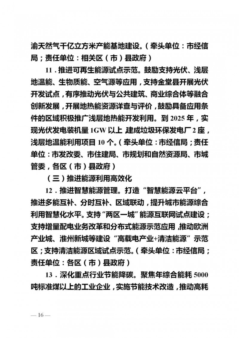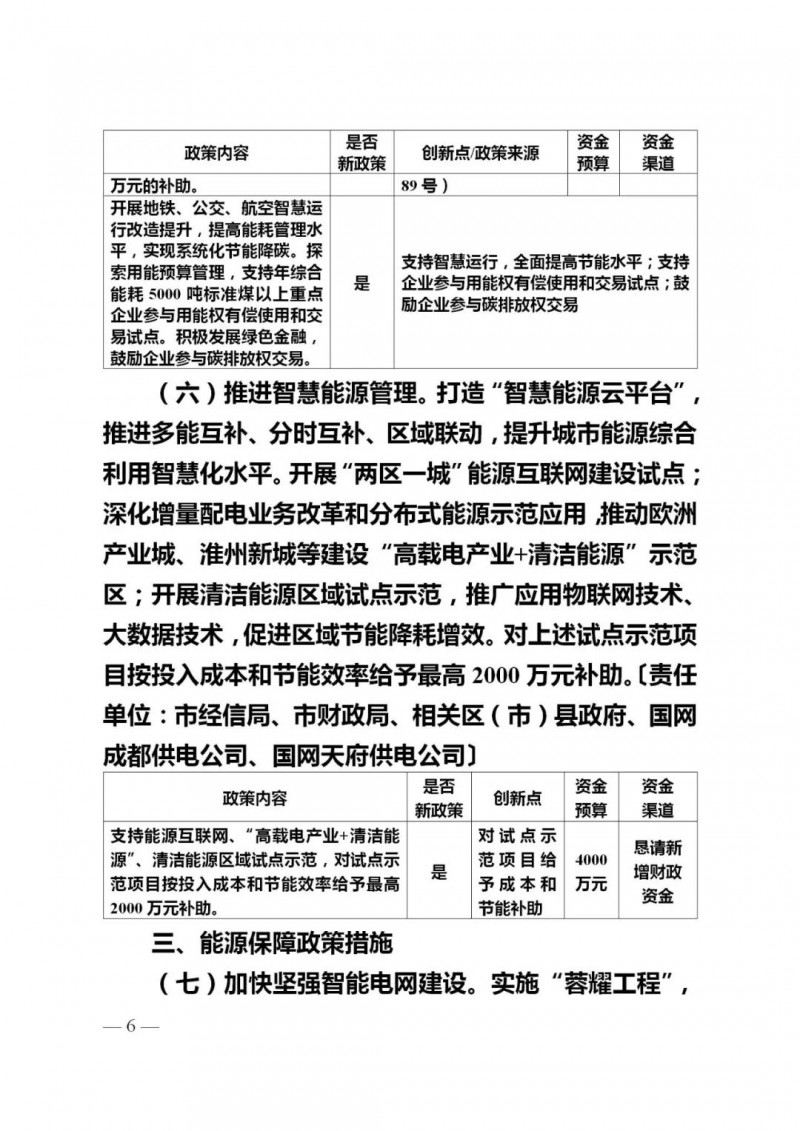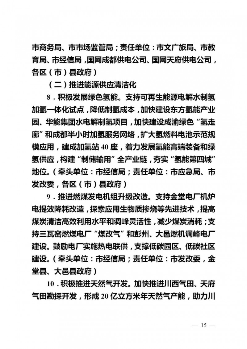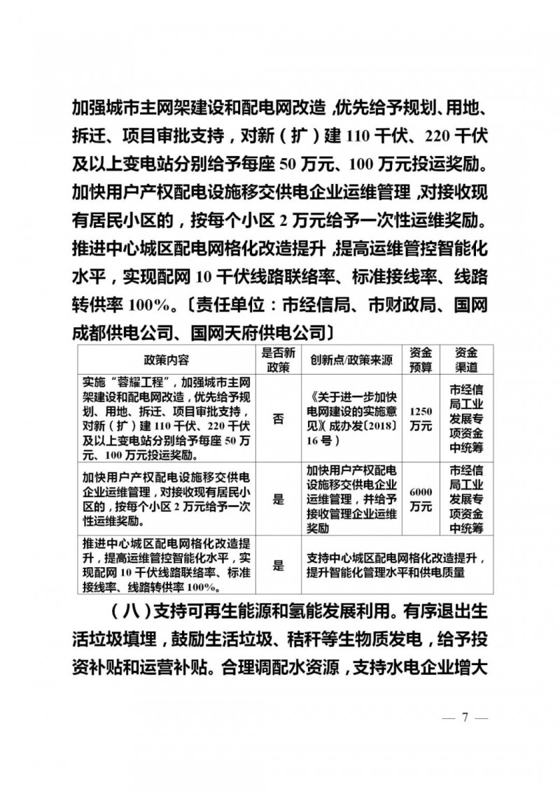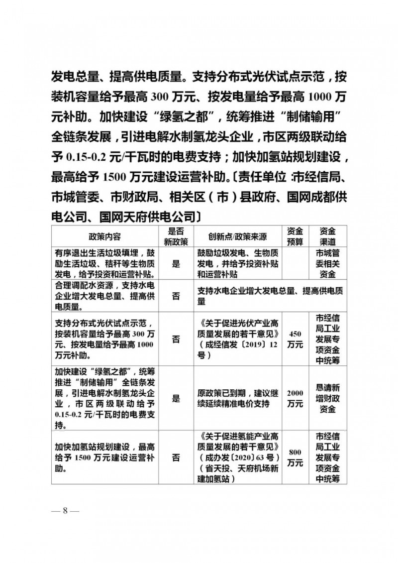 文件明確,支持可再生能源和氫能發展利用。有序退出生活垃圾填埋,鼓勵生活垃圾、秸稈等生物質發電,給予投資補貼和運營補貼。合理調配水資源,支持水電企業增大發電總量、提高供電質量。支持分布式光伏試點示范,按裝機容量給予最高300萬元、按發電量給予最高1000萬元補助。加快建設“綠氫之都”,統籌推進“制儲輸用”全鏈條發展,引進電解水制氫龍頭企業,市區兩級聯動給予0.15-0.2元/千瓦時的電費支持;加快加氫站規劃建設,最高給予1500萬元建設運營補助。