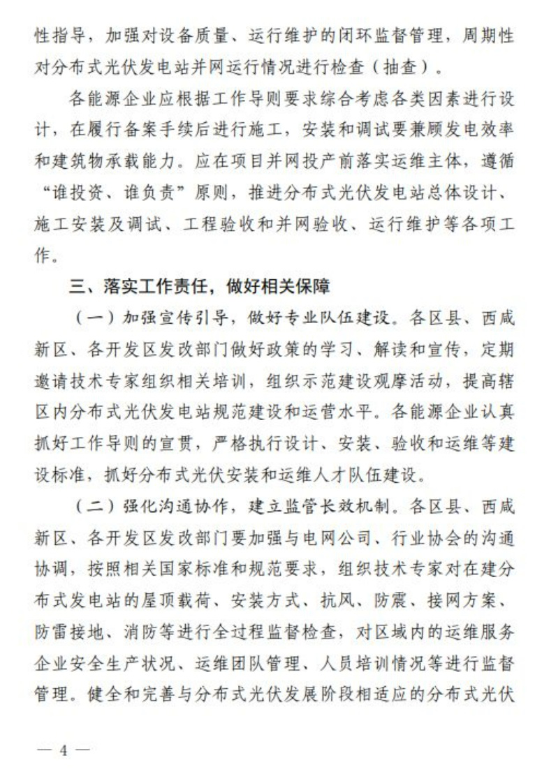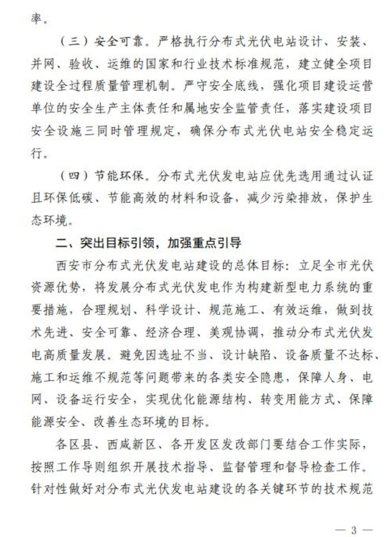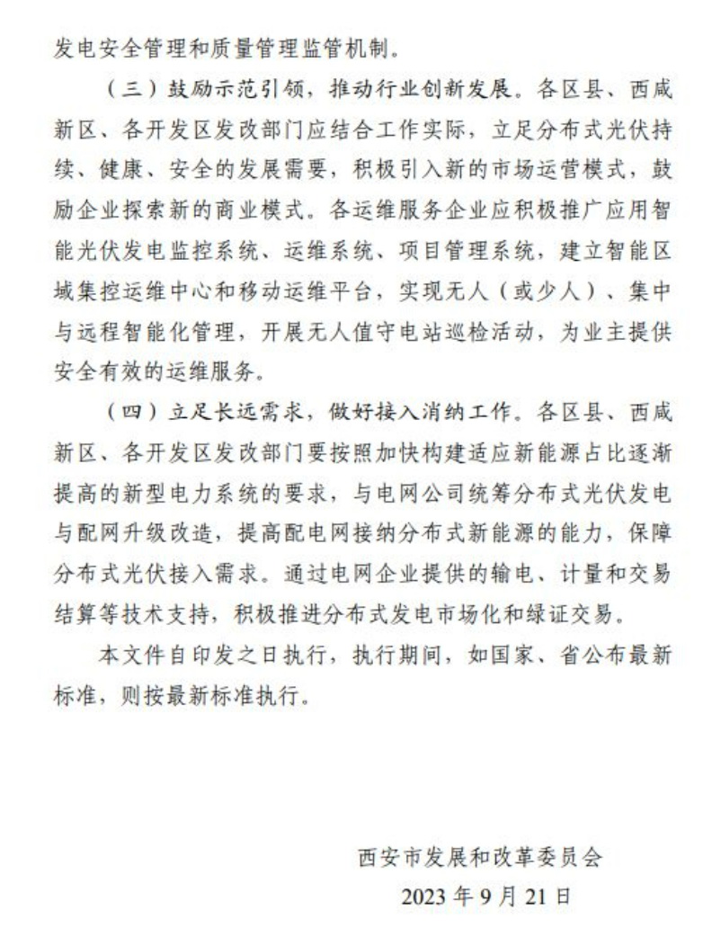 9月21日,西安市發改委發布《推進西安市分布式光伏電站建設工作導則(試行)》的通知,分布式光伏發電站可采用“自發自用”“自發自用,余電上網”或者“全額上網”等并網模式,所有新建、擴建或改建的分布式光伏發電站,履行項目備案、設計、安裝和驗收程序;戶用(自然人)分布式光伏發電站裝機容量原則上不超過50kW,且不得超過超出宅基地范圍;非自然人分布式光伏發電站單點并網裝機容量不超過6000kW,整村開發模式在電網無消納受限的區域,不設容量規模限制。