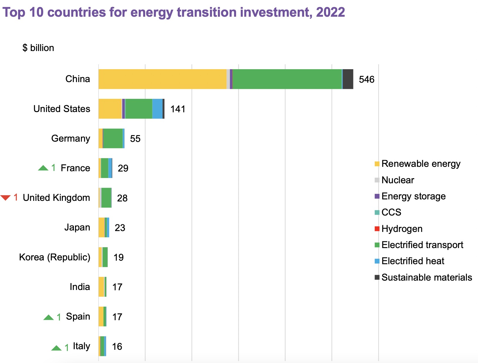 2022年能源轉型投資排名前10的國家,中國大幅領先,占全球投資總額近半
