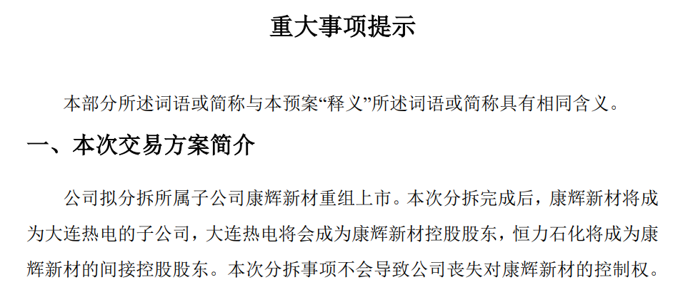 本次分拆完成后,大連熱電將會成為康輝新材的控股股東。其擬通過向康輝新材全體股東發行股份購買其合計持有的康輝新材100%股份,進而實現恒力石化分拆康輝新材重組上市。這在A股還是首次。