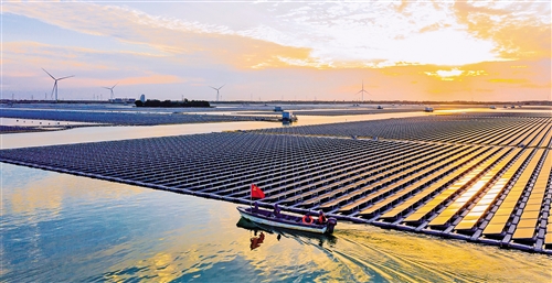 10月19日,國(guó)家電網(wǎng)彩虹服務(wù)隊(duì)隊(duì)員在山東德州丁莊華能光伏電站開(kāi)展日常維護(hù),排查涉電安全隱患,確保迎峰度冬用電穩(wěn)定。丁莊華能光伏電站是全球單體最大水面漂浮式光伏電站,一期100兆瓦項(xiàng)目近期并網(wǎng)發(fā)電。該項(xiàng)目全部建成后,每年可提供清潔能源4.2億千瓦時(shí)。宋偉龍攝(中經(jīng)視覺(jué))