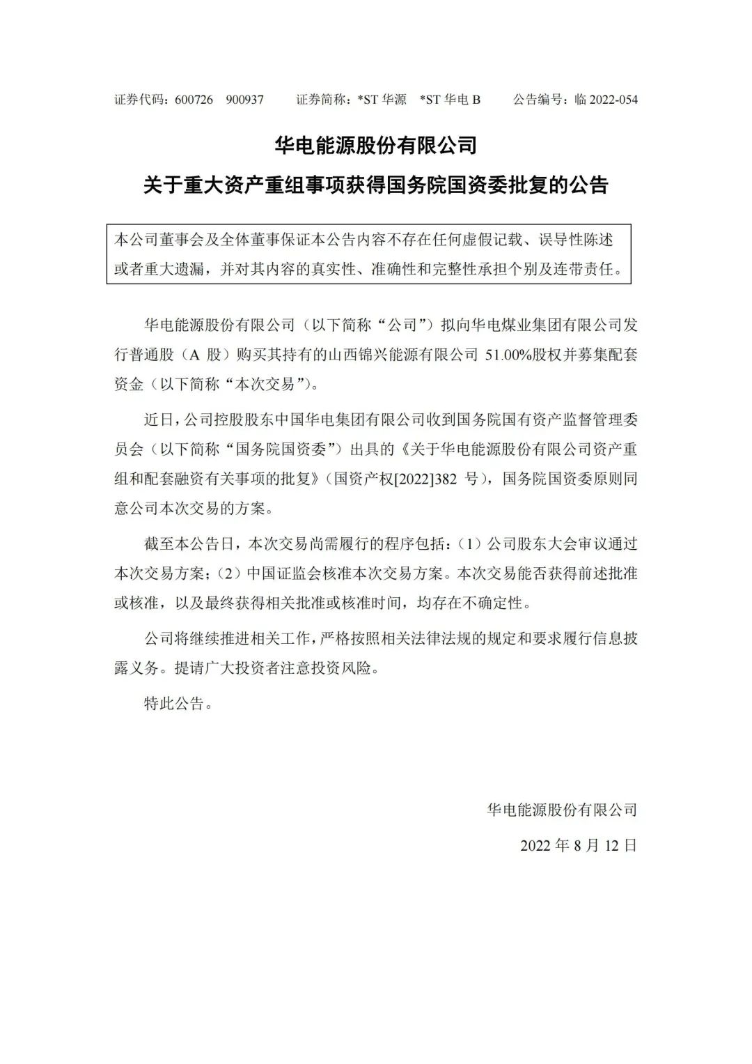 華電能源也發(fā)布公告,確認(rèn)重大資產(chǎn)重組事項(xiàng)獲得國(guó)務(wù)院國(guó)資委批復(fù)。