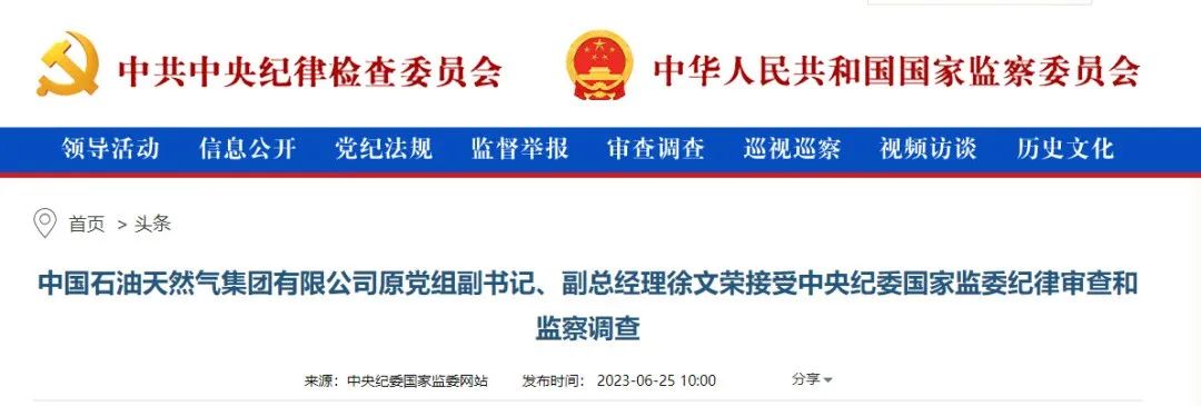 中央紀委國家監(jiān)委網(wǎng)站6月25日消息,中國石油天然氣集團有限公司原黨組副書記、副總經(jīng)理徐文榮接受中央紀委國家監(jiān)委紀律審查和監(jiān)察調查。