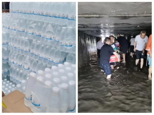 中化局物資籌措隊在涿州市分散采購礦泉水、干糧、充電寶、蠟燭等急需物資,密切關注交通運輸路況信息,第一時間打通物資通道。黨員干部和志愿者組成“人鏈”,手抱肩扛運送保障物資,搶時間、不停歇,保證基地群眾特別是離退休老職工家庭飲用水。