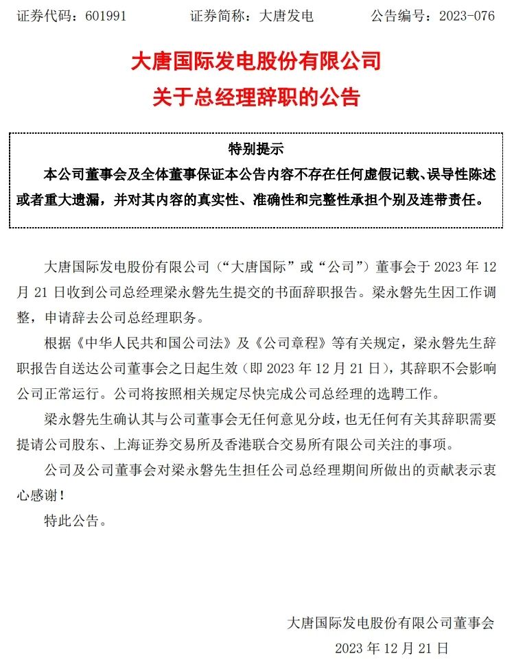 同日,大唐國際發布總經理辭職公告,公司董事會收到總經理梁永磐先生提交的書面辭職報告。梁永磐先生因工作調整,申請辭去公司總經理職務。