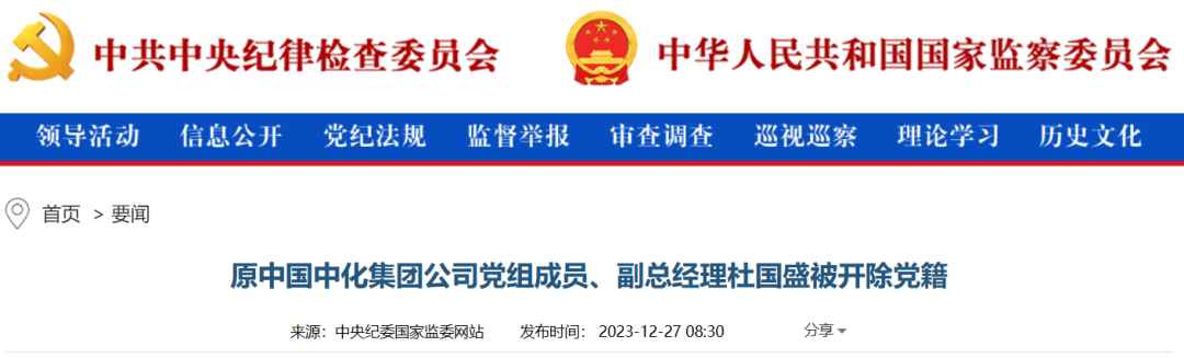 中央紀委國家監(jiān)委網(wǎng)站12月27日消息,據(jù)中國中化控股有限責(zé)任公司紀檢監(jiān)察組、福建省紀委監(jiān)委消息:日前,中國中化控股有限責(zé)任公司紀檢監(jiān)察組、福建省泉州市監(jiān)委對原中國中化集團公司黨組成員、副總經(jīng)理杜國盛嚴重違紀違法問題進行了紀律審查和監(jiān)察調(diào)查。