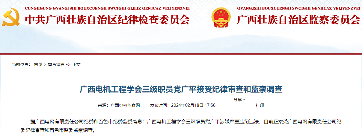 據廣西電網有限責任公司紀委和百色市紀委監委消息:廣西電機工程學會三級職員黨廣平涉嫌嚴重違紀違法,目前正接受廣西電網有限責任公司紀委紀律審查和百色市監委監察調查。