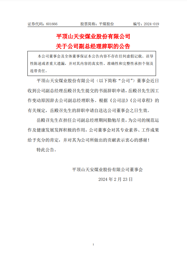 2月22日,平頂山天安煤業股份有限公司發布關于公司副總經理辭職的公告。