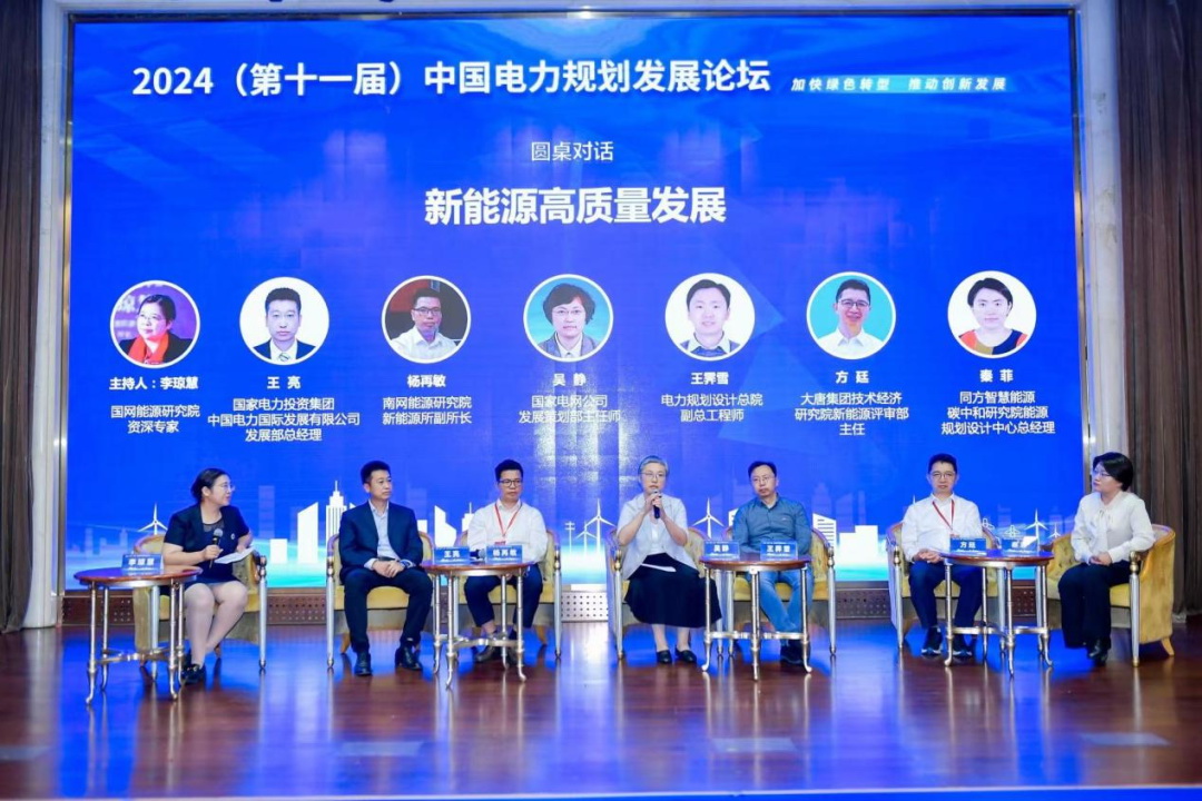 論壇同期舉辦了兩場圓桌對話。新能源高質(zhì)量發(fā)展圓桌對話由國網(wǎng)能源研究院資深專家李瓊慧主持,國網(wǎng)發(fā)展策劃部主任師吳靜,電力規(guī)劃設(shè)計(jì)總院副總工程師王霽雪,南網(wǎng)能源研究院新能源所副所長楊再敏,大唐集團(tuán)技術(shù)經(jīng)濟(jì)研究院新能源評審部主任方廷,國家電力投資集團(tuán)中國電力國際發(fā)展有限公司發(fā)展部總經(jīng)理王亮,同方智慧能源碳中和研究院能源規(guī)劃設(shè)計(jì)中心總經(jīng)理秦菲,共同圍繞當(dāng)前新能源發(fā)展面臨的機(jī)遇和挑戰(zhàn),結(jié)合自己的業(yè)務(wù)實(shí)際,就如何實(shí)現(xiàn)高質(zhì)量發(fā)展進(jìn)行了互動(dòng)交流。