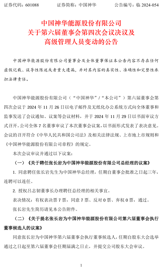 中國神華11月30日發布公告,公司第六屆董事會第四次會議于2024年11月26日以電子郵件及無紙化辦公系統方式向全體董事和監事發送了會議通知、議案等會議材料,并于2024年11月29日以書面審議方式召開。公司全體7名董事審議了本次董事會議案,以書面形式發表了表決意見。