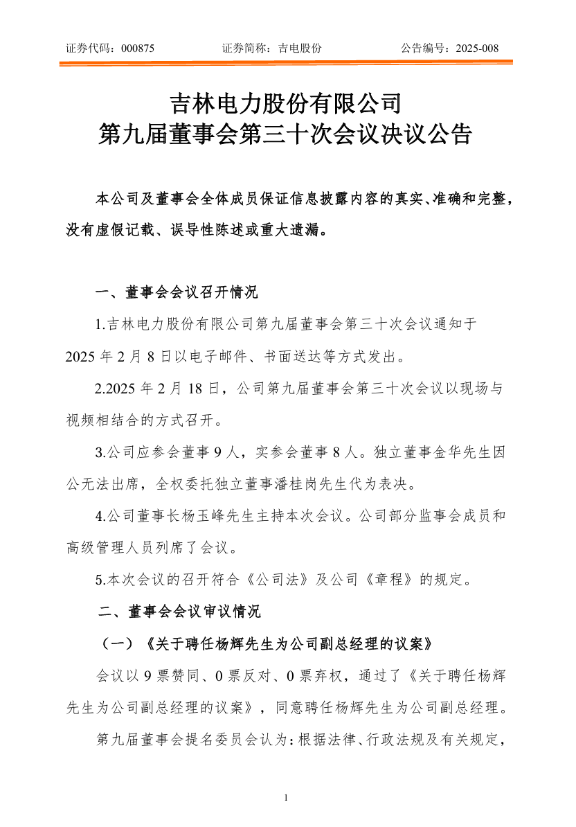 2月18日,吉電股份發布公告稱,公司第九屆董事會第三十次會議審議通過了《關于聘任楊輝先生為公司副總經理的議案》,同意聘任楊輝先生為公司副總經理。