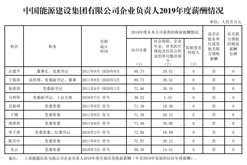 中國電力建設集團有限公司企業負責人2019年度薪酬情況