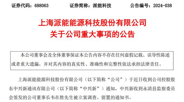 派能科技19日晚間披露的公告顯示,公司近日收到控股股東中興新通知,中興新收到永清縣監察委員會簽發的公司董事長韋在勝被立案調查、留置的通知書。
