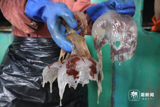 “我平常在辦公室工作的,今天第一次來(lái)抓海蜇,上午從8點(diǎn)半站到下午1點(diǎn)半,已經(jīng)抓了10袋。”一位工人告訴記者,他是第一次抓海蜇,濾網(wǎng)上的海蜇大的能有2斤重,抓摘手法不能太重也不能太輕,力氣大了海蜇碎掉,更不好清理。