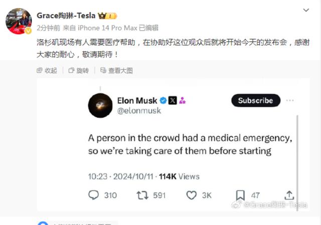 北京時間10月11日消息,原定于北京時間10點舉行的特斯拉Robotaxi發布會已經推遲了半個小時,至今還未開始。正當大家紛紛猜測緣由時,馬斯克在社交媒體上公布了原因,稱現場有人突發疾病暈倒需要照顧,因此發布會推遲舉行,但他未確定具體開始的時間。