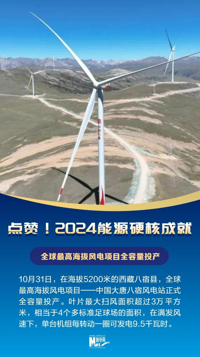 10月31日,在海拔5200米的西藏昌都市八宿縣,全球最高海拔風電項目——中國大唐八宿風電站正式全容量投產。項目共安裝20臺風電機組,風機輪轂中心高度110米,葉輪直徑195米,葉片最大掃風面積超過3萬平方米,相當于4個多標準足球場的面積,在滿發風速下,單臺機組每轉動一圈可發電9.5千瓦時。