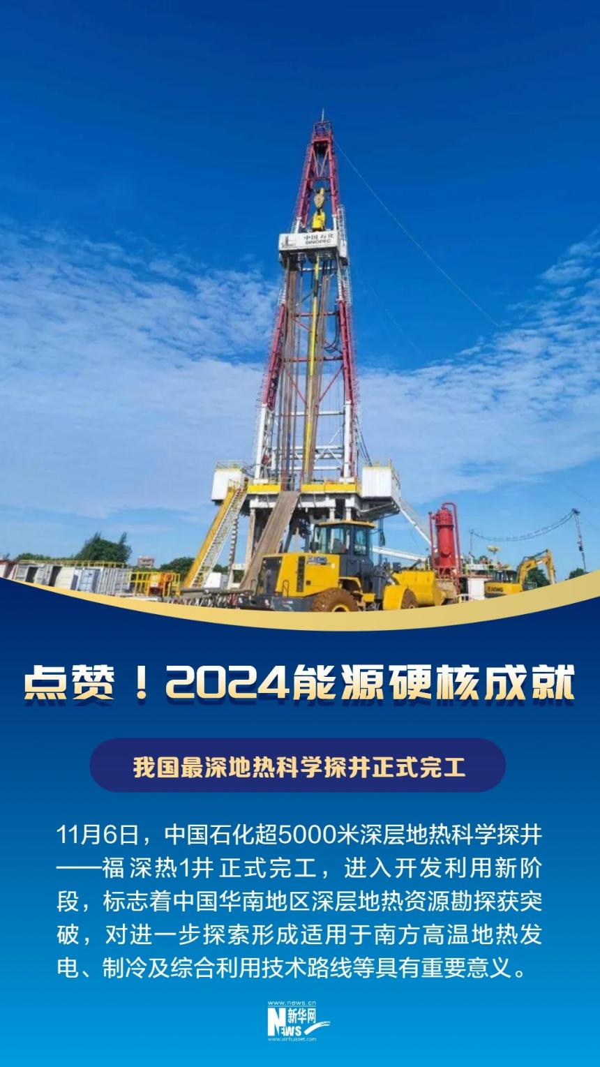 11月6日,中國石化超5000米深層地熱科學探井——福深熱1井正式完工,進入開發利用新階段,標志著中國華南地區深層地熱資源勘探獲突破,對進一步探索形成適用于中國南方地區的高溫地熱發電、制冷及綜合利用技術路線等具有重要意義。