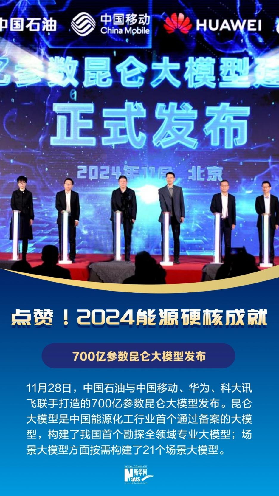 11月28日,中國石油與中國移動、華為、科大訊飛聯手打造的700億參數昆侖大模型發布。昆侖大模型是中國能源化工行業首個通過備案的大模型,于2024年5月正式啟動建設,3個月后參數量級達到330億。此次發布的昆侖大模型,在行業大模型方面參數從330億升級到700億,自然語言處理、語音視覺識別、多模態交互、科學計算等專業能力大幅提升,視覺大模型訓練數據進一步豐富;在專業大模型方面構建了我國首個勘探全領域專業大模型;場景大模型方面按需構建了21個場景大模型。