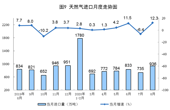 天然氣進口增速由負轉正。8月份,進口天然氣936萬噸,同比增長12.3%,上月為下降6.4%。1—8月份,進口天然氣6507萬噸,同比增長3.3%。