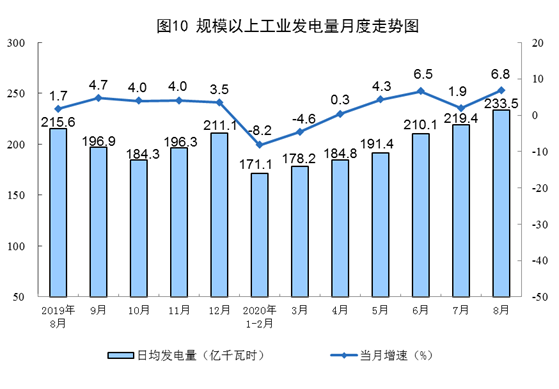 電力生產較快增長。8月份,發電量7238億千瓦時,同比增長6.8%,增速比上月加快4.9個百分點;日均發電量233.5億千瓦時,環比增加14.1億千瓦時。1—8月份,發電量47728億千瓦時,同比增長0.3%。