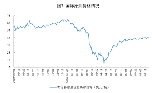 原油進口增速回落,國際原油價格小幅上漲。8月份,進口原油4748萬噸,同比增長12.6%,增速比上月回落12.4個百分點。1—8月份,進口原油3.7億噸,同比增長12.1%。8月28日布倫特原油現貨離岸價格為45.22美元/桶,比7月31日的43.13美元/桶上漲4.8%。