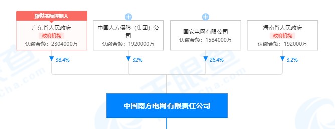 根據公開資料查詢,本次調整前中國南方電網總注冊資本為600億元。共有4家股東,股本比例是:廣東省人民政府出資230.4億,占比38.4%,為第一大股東,中國人壽保險(集團)公司出資192億,占比32%,排名第二,國家電網有限公司出資158.4億,占比26.4%,排名第三,海南省人民政府認繳19.2億,占比3.2%,排名最末。