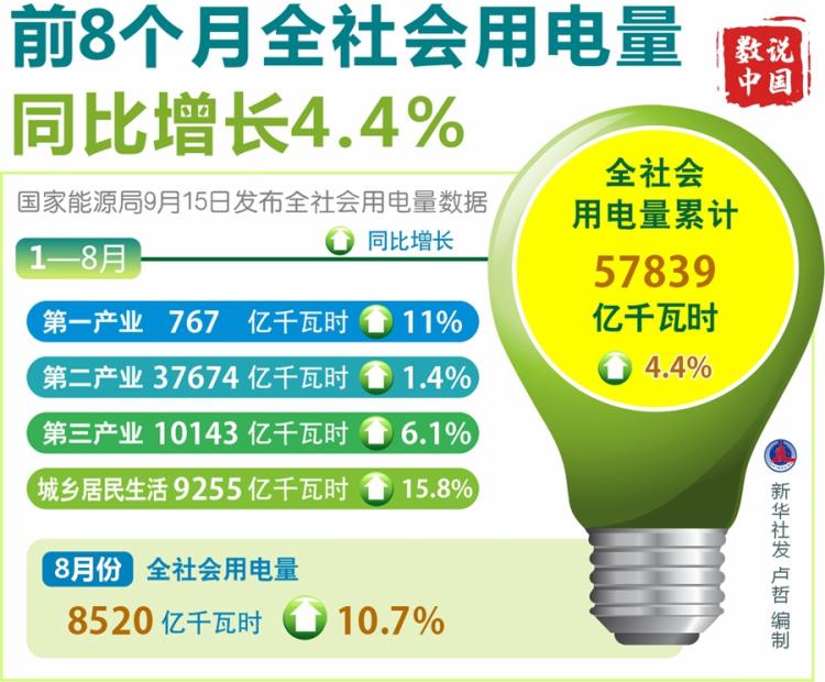 本網訊 國家能源局15日發布今年前8個月全社會用電量數據。今年前8個月全社會用電量累計57839億千瓦時,同比增長4.4%。