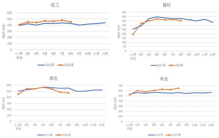 8月份,化工行業用電量452億千瓦時,同比增長2.7%;建材行業用電量354億千瓦時,同比下降6.7%;黑色金屬冶煉行業用電量474億千瓦時,同比下降15.0%;有色金屬冶煉行業用電量652億千瓦時,同比增長7.1%。