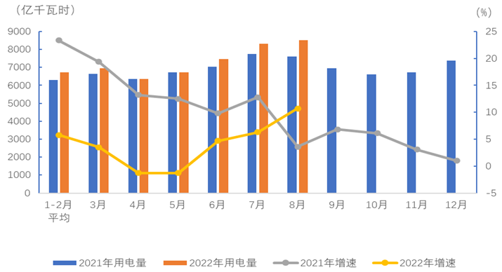1-8月,全社會用電增速同比提高,第一產業、第三產業和城鄉居民生活用電量增速高于全社會平均水平;全國28個省份全社會用電量實現正增長;工業和制造業用電量增速低于全社會平均水平;化工和有色行業用電量正增長,建材和黑色行業用電量負增長。