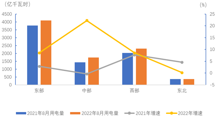 8月份,東、中、西部和東北地區全社會用電量增速分別為8.6%、22.3%、8.6%和0.2%。