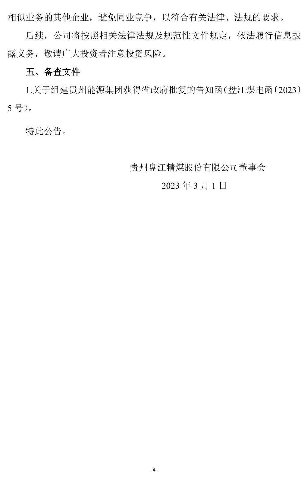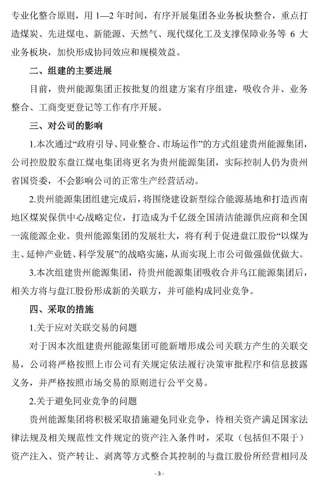 3月1日,盤江股份發布《關于控股股東更名的公告》(以下簡稱《公告》)。貴州省擬組建貴州能源集團有限公司(以下簡稱“貴州能源集團”),將盤江煤電集團更名為貴州能源集團。吸收合并貴州烏江能源集團有限責任公司(以下簡稱“烏江能源集團”)后,注銷烏江能源集團。