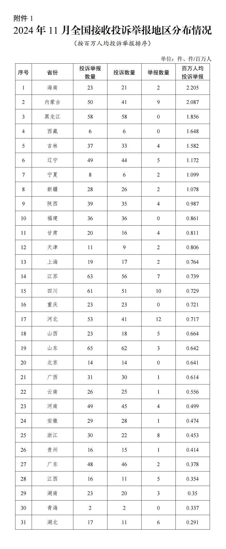 各省(自治區、直轄市)按照接收投訴舉報數量排序,山東、江蘇、四川、黑龍江、河北排在全國前5位。按百萬人均投訴舉報數量排序,海南,內蒙,黑龍江,西藏,吉林排在全國前5位。(2024年11月全國接收投訴舉報地區分布情況見附件1)