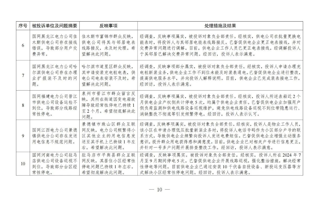 針對群眾反映的投訴舉報,國家能源局派出機構嚴格按照有關法規政策規定進行處理。一是督促供電企業進一步規范用電報裝管理,強化業擴報裝全流程管控,嚴格按照規定時限完成裝表接電;二是要求供電企業加強設備隱患排查整治,強化停電搶修管理,合理規劃計劃停電,增加搶修資源投入,提升設備管控和停電搶修能力,切實提高供電可靠性;三是通過行政處罰、監管約談、責令整改等方式,糾正有關企業違法違規行為,維護公平公正的市場秩序和群眾合法權益;四是通過解釋說明、澄清事實,消除群眾誤解。(2024年11月12398熱線典型投訴舉報事項具體處理情況見附件2)