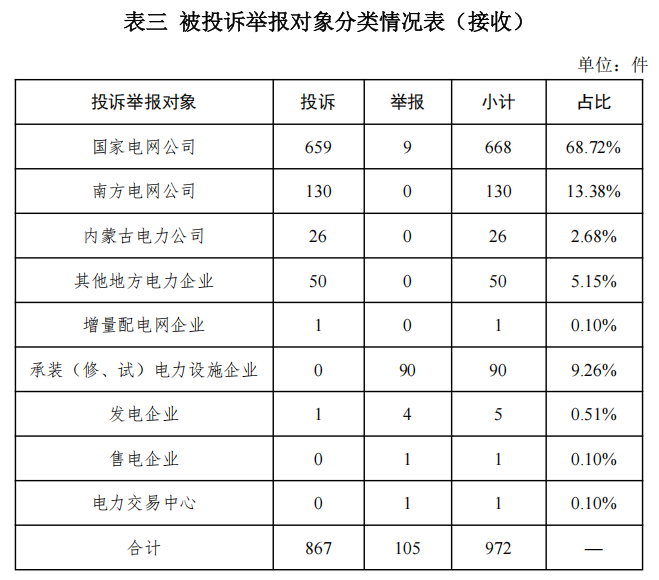 供電企業875件、占投訴舉報總數的90.02%,其中國家電網公司668件、占投訴舉報總數的68.72%,南方電網公司130件、占投訴舉報總數的13.37%,內蒙古電力公司26件、占投訴舉報總數的2.67%,其他地方電力企業50件、占投訴舉報總數的5.14%,增量配電網企業1件、占投訴舉報總數的0.10%;承裝(修、試)電力設施企業90件、占投訴舉報總數的9.26%;發電企業5件,占投訴舉報總數的0.51%;售電企業1件、占投訴舉報總數的0.1%;電力交易中心1件、占投訴舉報總數的0.1%。