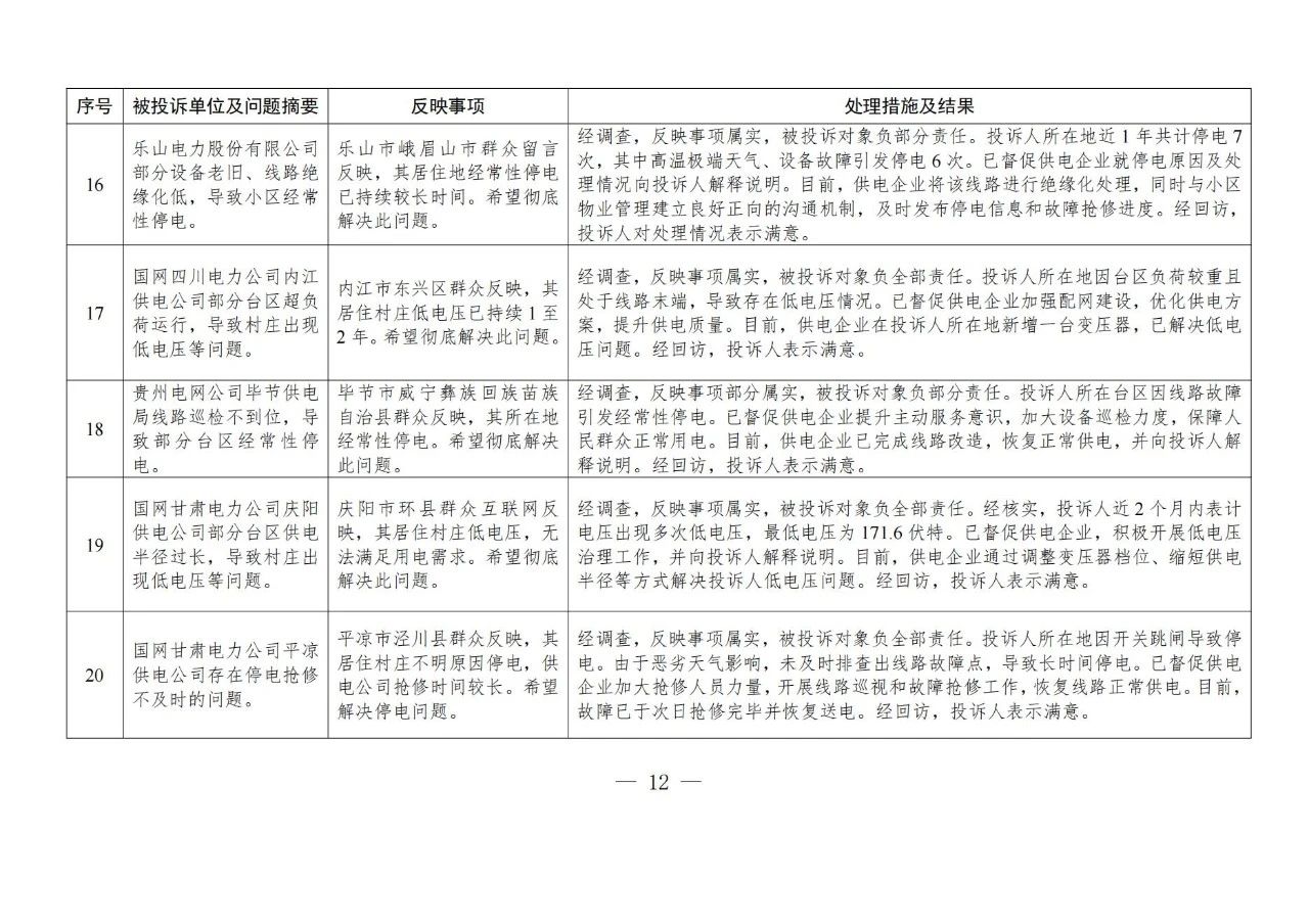 3.電能質量問題。供電設施運維不到位或用電負荷激增,導致經常停電和低電壓問題較多。相關投訴舉報數量靠前的2個省份為黑龍江(16件)、四川(13件)。