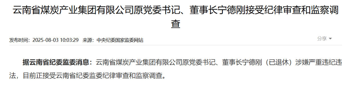 據云南省紀委監委8月3日消息,云南省煤炭產業集團有限公司原黨委書記、董事長寧德剛(已退休)涉嫌嚴重違紀違法,目前正接受審查調查。