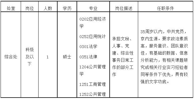 綜合處主任科員及以下崗位1人(京內生源的碩士應屆畢業(yè)生)。35周歲以內,中共黨員,要求政治素質高,服務意識、團隊意識佳,有基礎的數(shù)據(jù)、信息分析能力,同等條件下有相關課題研究或相關行業(yè)實習經驗者優(yōu)先,具有較強的文字功底。具體要求詳見下表。