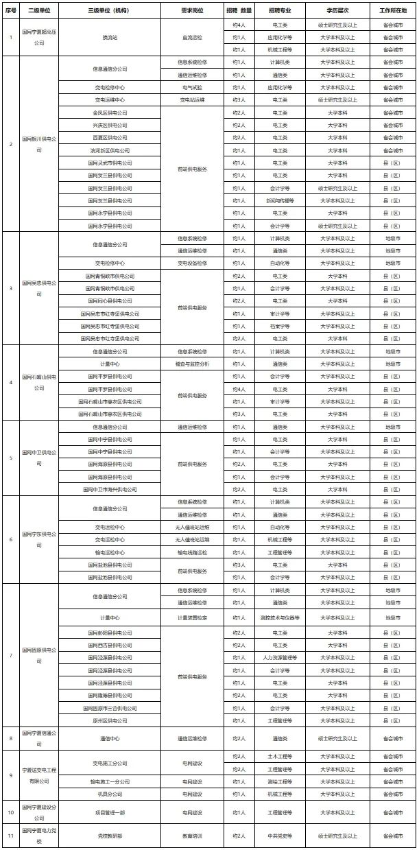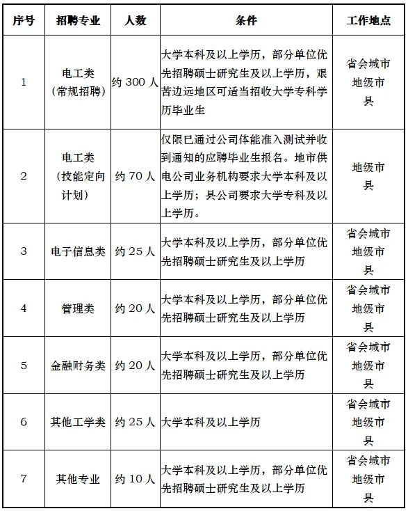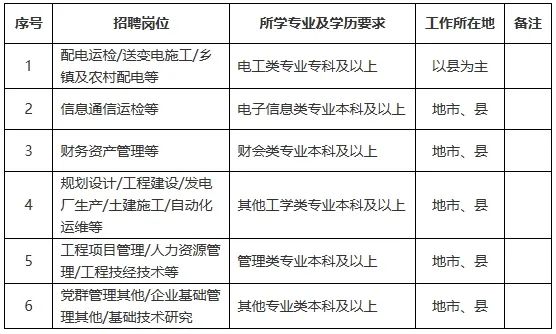 (二)招聘崗位:規劃、建設、運?、運維檢修、營銷、信息通信、物資和培訓教育等專業?線崗位。