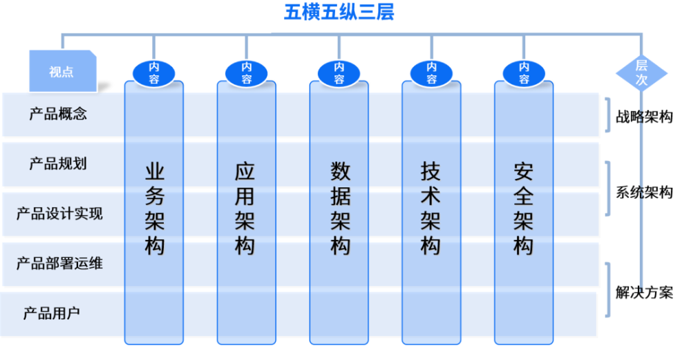 五縱,即縱向包括的五大架構設計——業務架構、應用架構、數據架構、技術架構、安全架構。