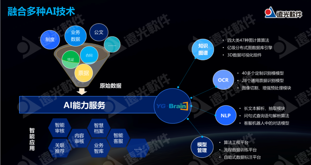 2、以自研AI技術搭建智慧橋梁遠光軟件積累了大量新型技術的開發能力,如大數據分析、AI、區塊鏈以及自主研發智能硬件的能力,通過YG-RPA云平臺作為連接器,與新型智能化技術進行連接、集成,最終形成以RPA機器人為抓手的智能化解決方案。
